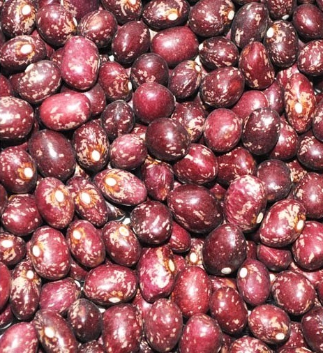 La alubia Tolosana Roja es de color morado oscuro moteada con tonos más claros y muy brillante.